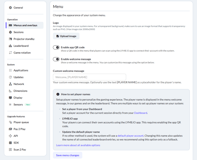 By default, your system menu displays a QR code players can use to connect their LYMB.iO app to your system. Disable the Enable app QR code switch to remove this QR code from your system. Click Save menu changes to apply the changes to your menu.
