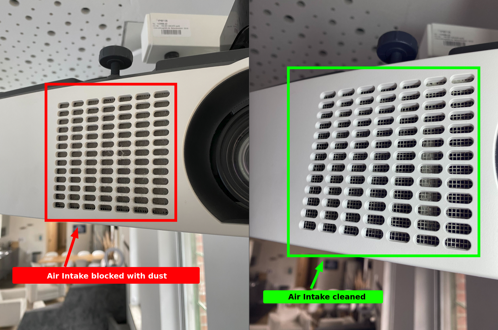 Our projectors are almost maintenance-free, but as with every device that depends on the environmental conditions. From time to time it is therefore advisable to clean the projector air intake and outlet. How often that is required depends on how dust-heavy the room is, we recommend cleaning it at least once a year. Most projectors show an overheating on the screen and/or have an LED showing a temperature problem.